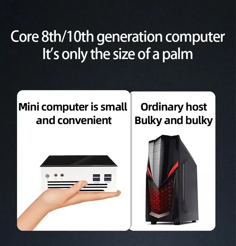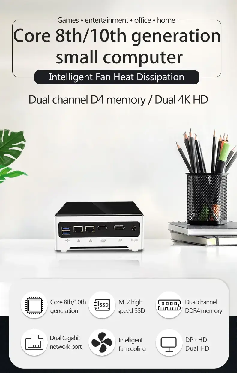 HG001 High-Performance Mini PC: Supports 8th/10th Gen Core Processors, Dual DDR4 Slots, Dual Ethernet Ports + HDMI + DP 4K HD Output.