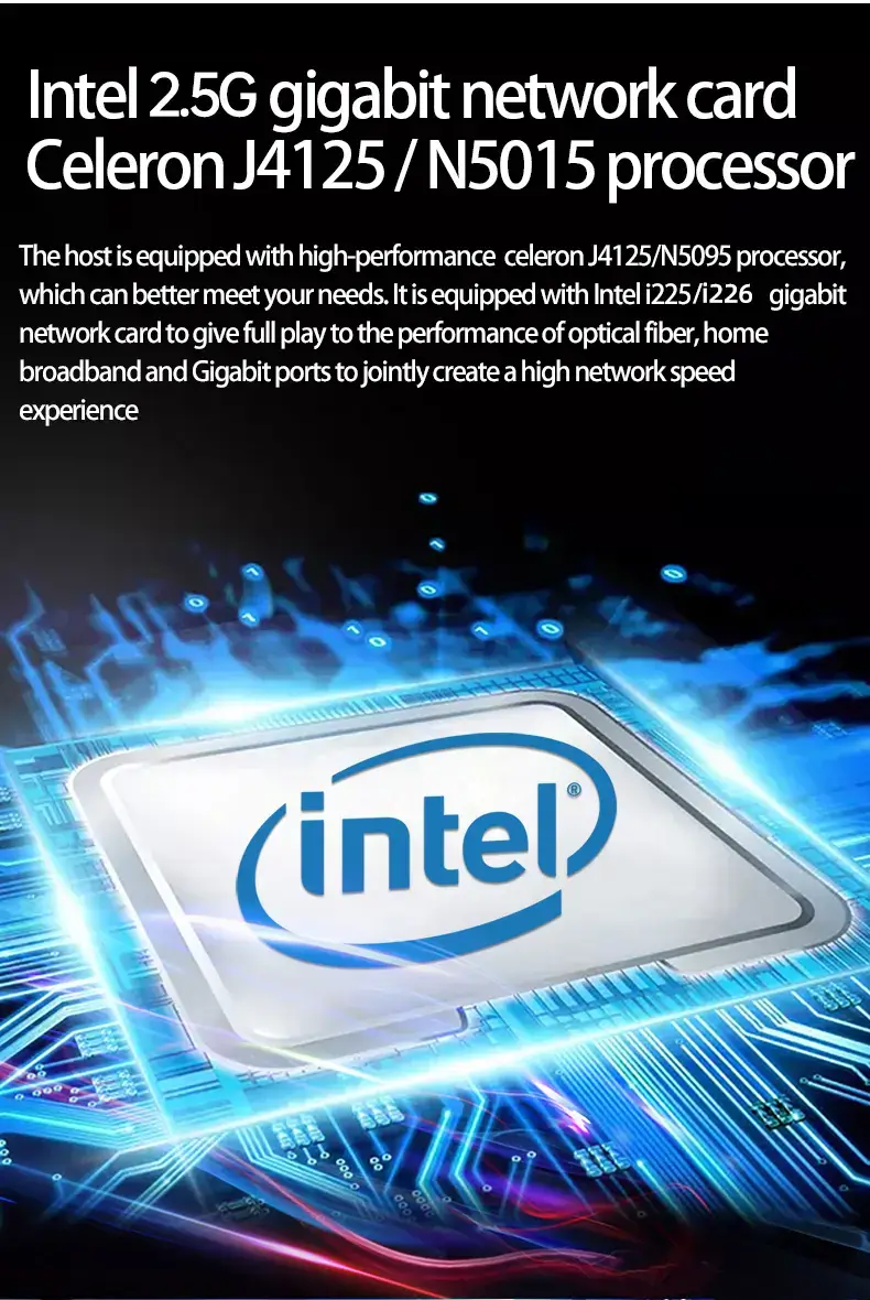 • 4-Port 2.5G Array: Equipped with four Intel 2.5GbE LAN ports, it fully unleashes multi-gigabit internet speeds and supports virtualization, link aggregation, and firewall OS (e.g., OpenWrt, pfSense).