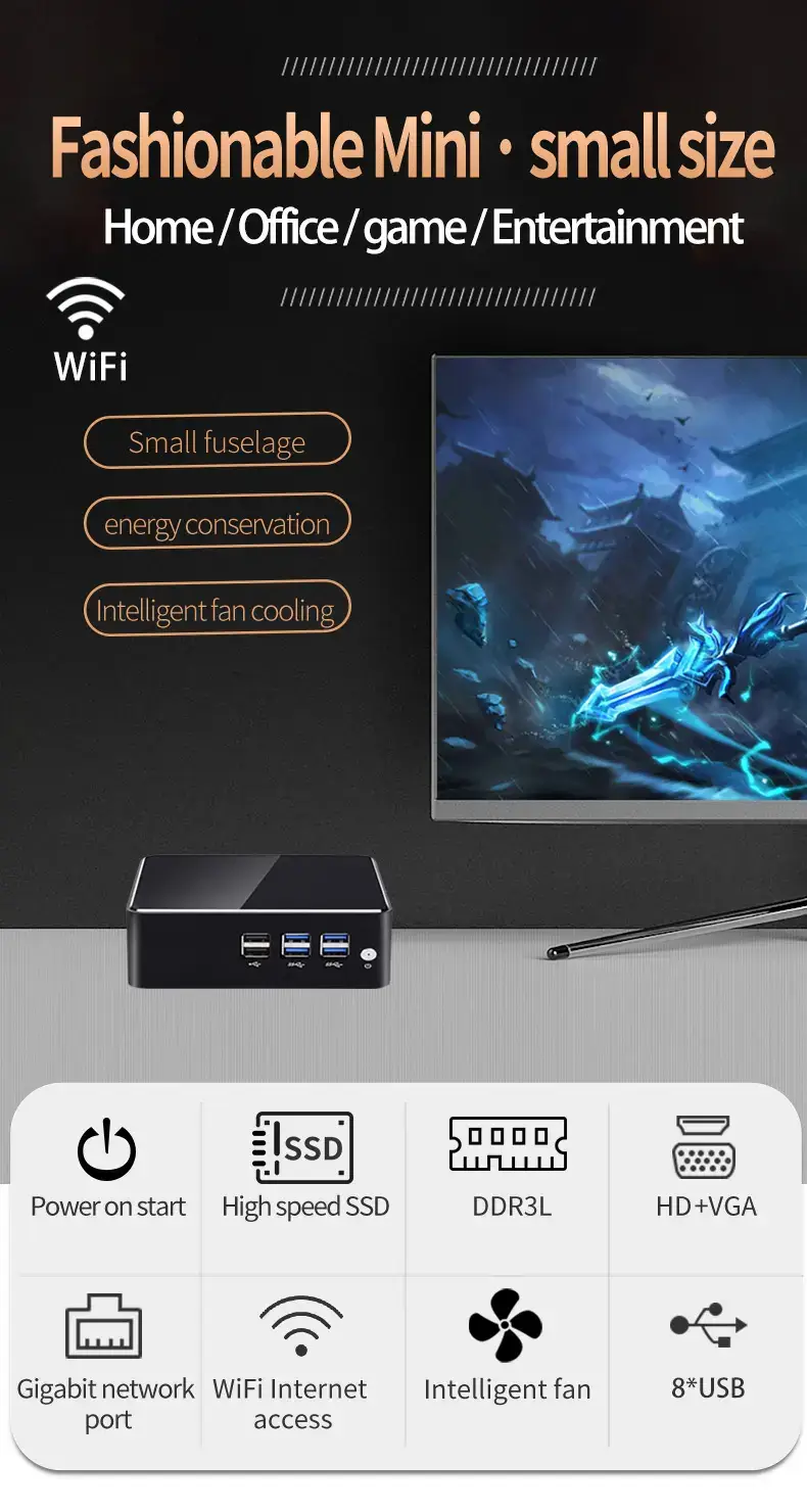 YC027 Entry-Level Mini PC (Celeron/Pentium Series) – 8 USB Ports | Dual Display (VGA+HD) | Compact Business Office Desktop