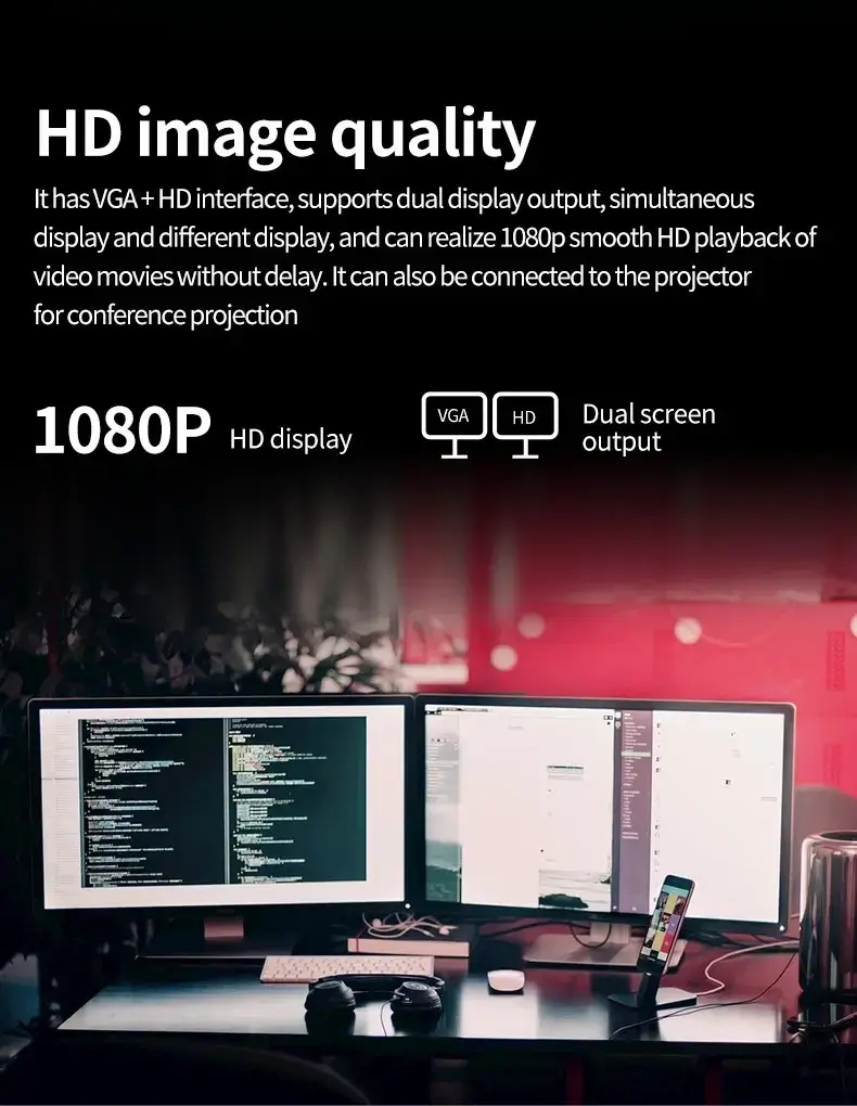 • Universal Display Compatibility: Equipped with both HDMI (HD) and VGA ports, the system supports dual-screen output, ensuring seamless compatibility with a wide range of displays—from modern monitors to legacy projectors.