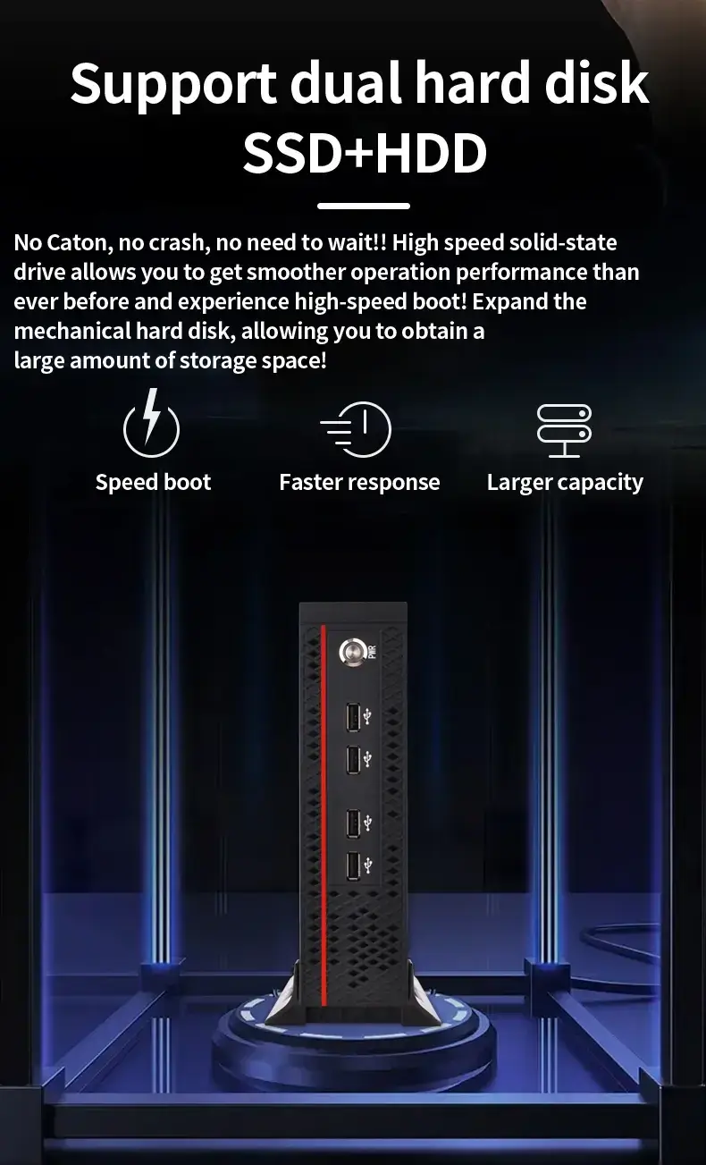 The YCD006 is a versatile vertical Mini PC balancing performance and value. Compatible with Intel Core 3rd, 4th, and 6th Gen processors, its multi-interface design makes it an ideal upgrade for business and home office setups.